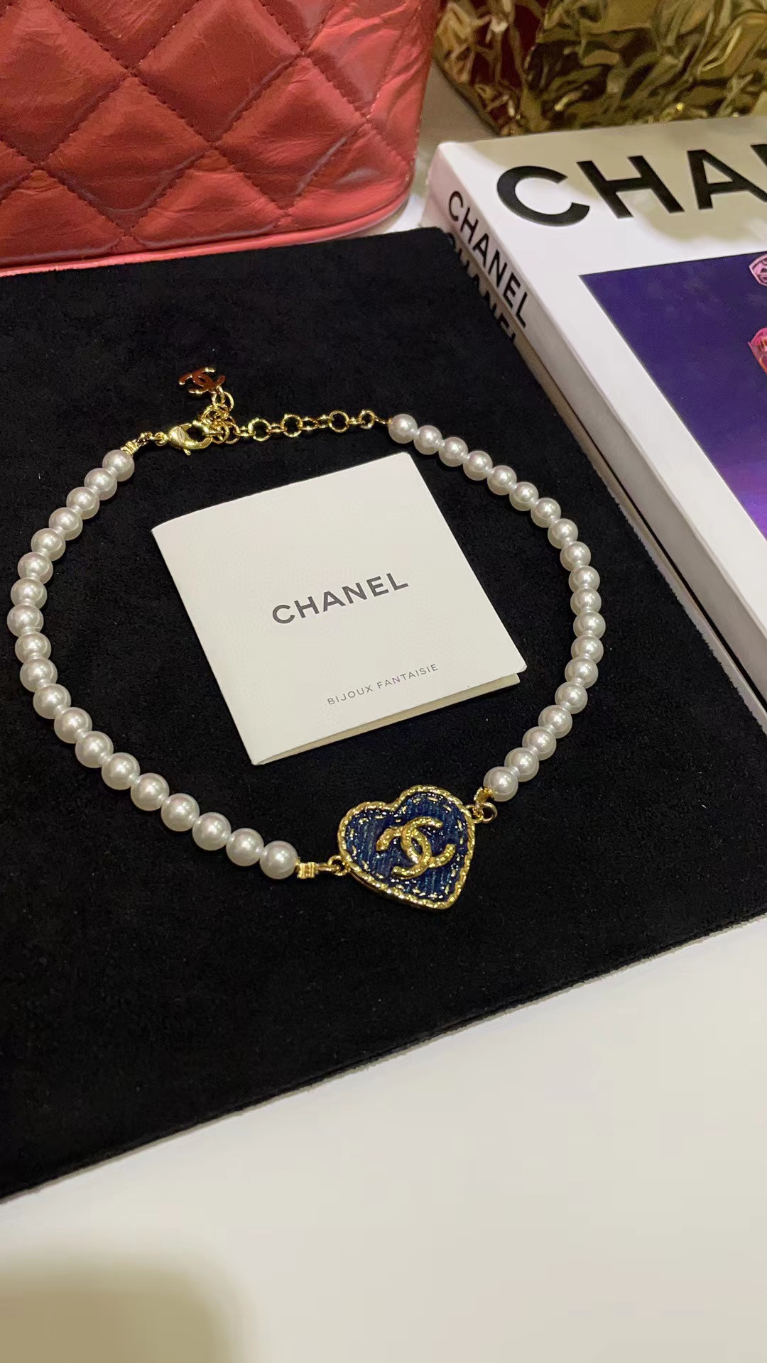 CHANE1 ブルー ダブル C ハート パール ネックレス