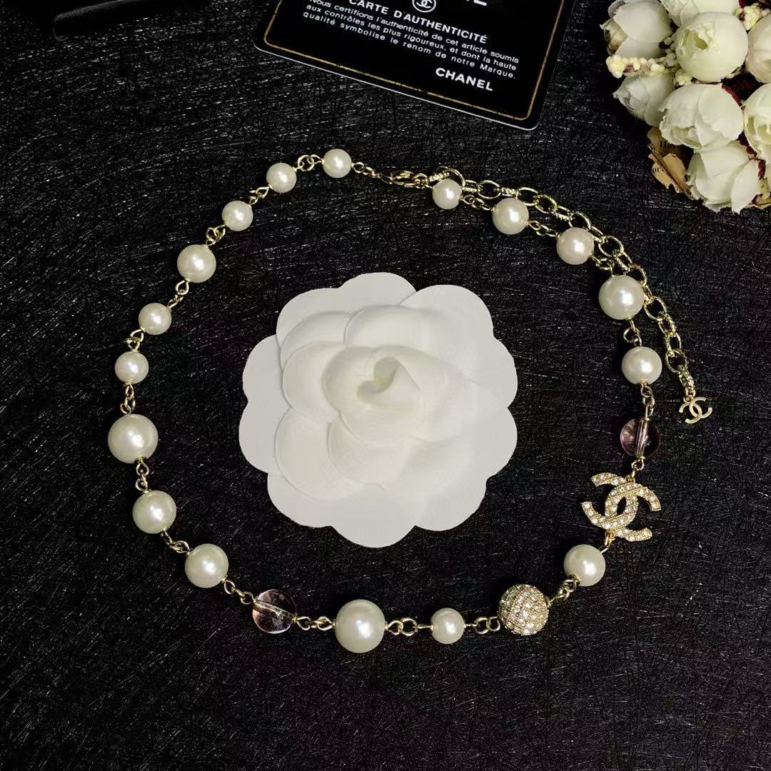 CHANE1 ピンクガラス フルダイヤモンド パールネックレス【 50%割引+送料無料】